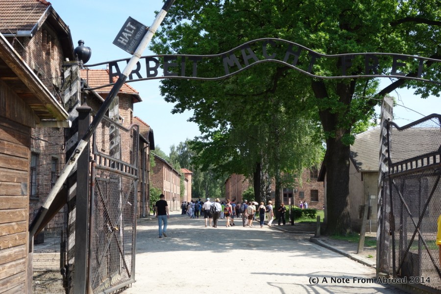Entry gate at Auschwitz I with sign overhead