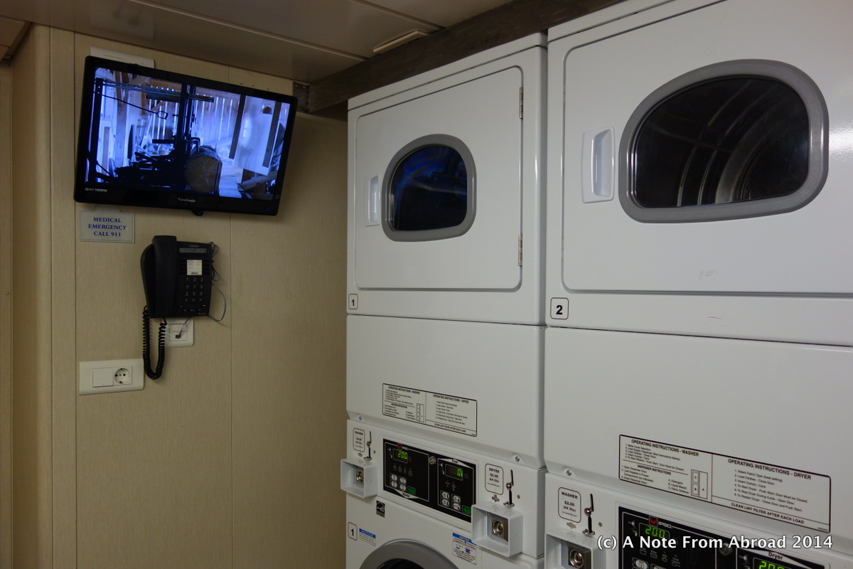 Finally Tim’s luggage managed to find our cabin. After getting him unpacked, we sorted our dirty clothes and headed to the on-board laundromat. There are eight stackable washers and dryers on board. For $2 a load you can wash and then another $2 to dry. Within an hour and 1/2 we were done, clothes clean, folded and tucked into drawers in our cabin – just in time to go to our 8:15 dinner in the main dining room.