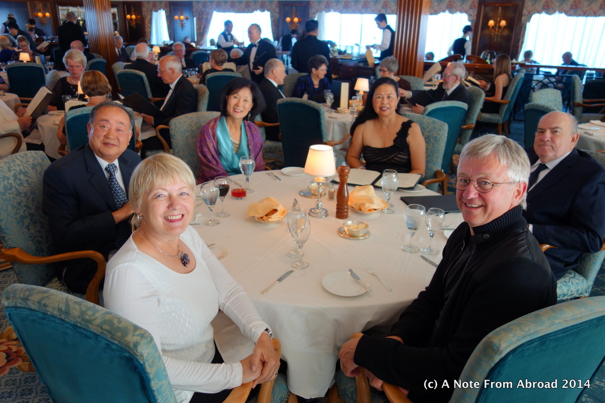 In the dining room, we have an assigned table for six. Marcie and her husband Ted are a Korean couple also from the Los Angeles area. They are both dentists and are celebrating that the youngest of their three children has just graduated from dental school as well. They have successfully put three children each through 8 years of college. That is 24 years worth of paying tuition finally completed. A worthy thing to celebrate indeed!