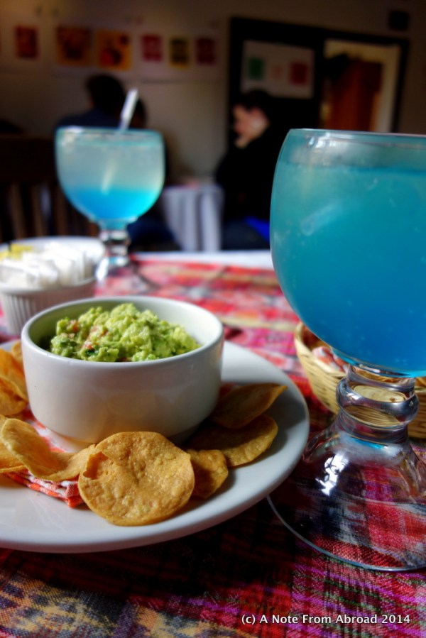 Yummy quacamole and chips with lemonade (not sure why it was blue)