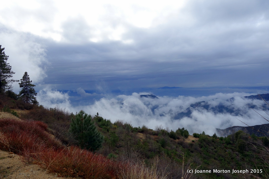 San Bernardino Mountains with a layer of fog. This was taken on Sunday morning when on our way down the mountain from our cabin. Had to take care of some business in “the city” before being gone for a month.