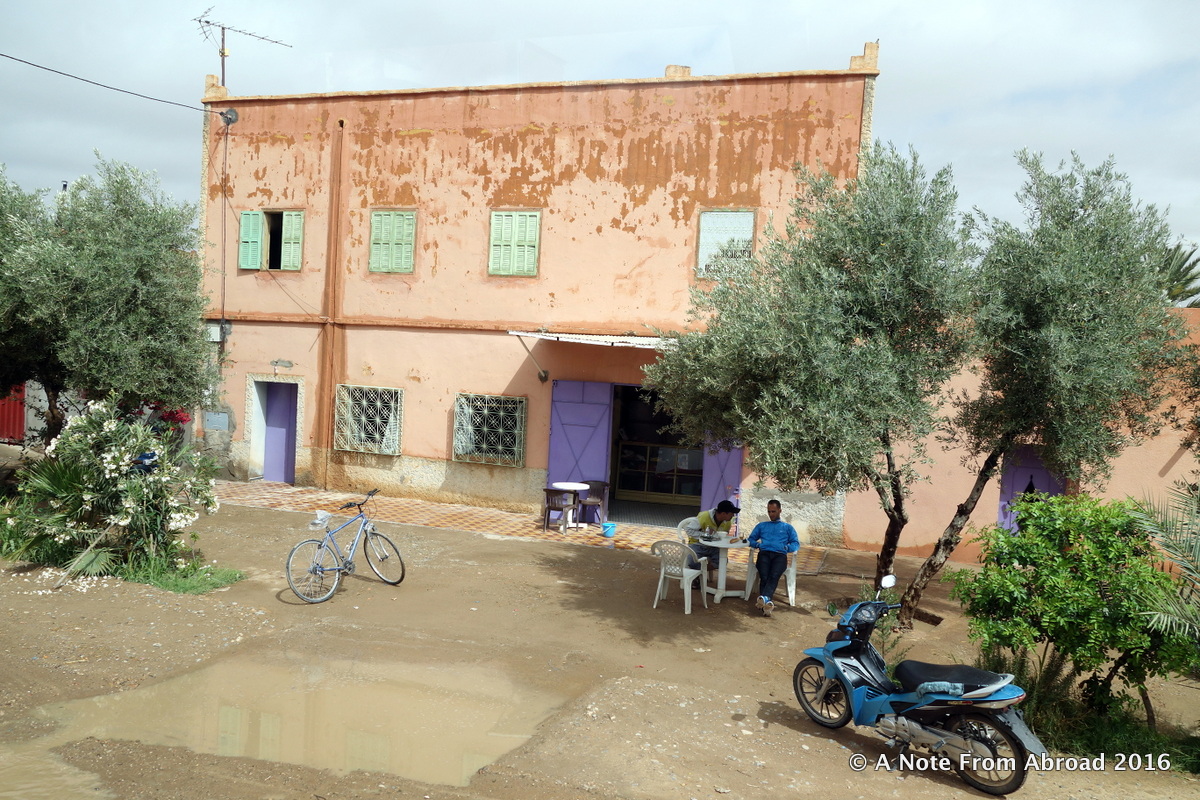 More stucco walls with men gathered under a tree