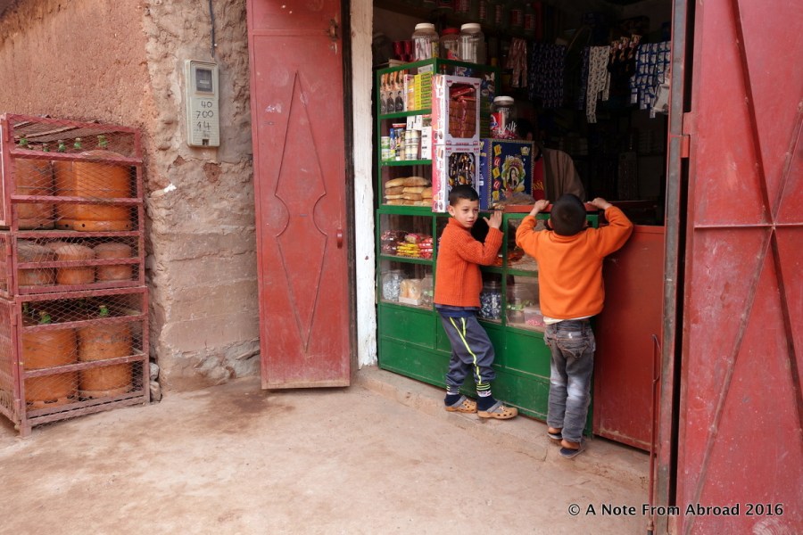 Two young boys peering into the tiny store