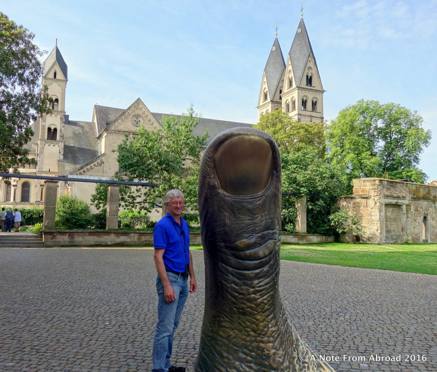 Tim next to a statue of a thumb
