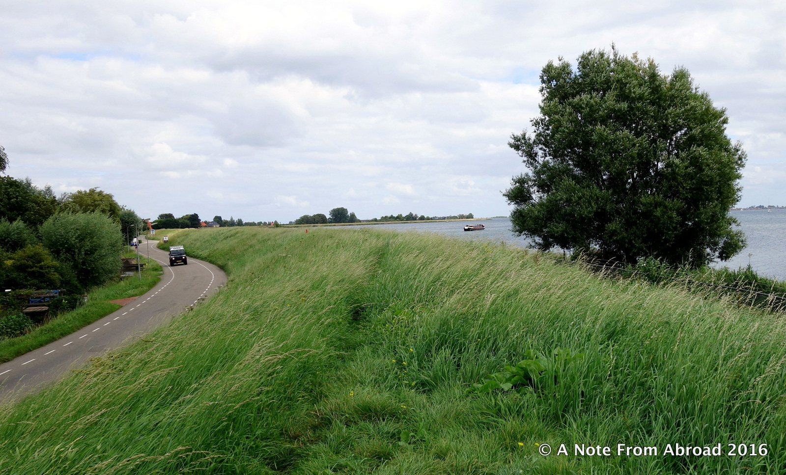 Earthen dike covered with grass with the water level higher than the road