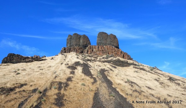 “Coyote, the mischievous spirit hero of many native stories, fell in love with three sisters who were building a salmon trap on the river near here. Each night Coyote would destroy their trap, and each day the girls would rebuild it. One morning coyote saw the girls crying and found out that they were starving because they had not been able to catch any fish in their trap. Coyote promised them a working fish trap if they would become his wives. They agreed, and coyote kept his promise; however, over the years he became jealous of them. He changed two of the wives into these basalt pillars and turned the third into a cave downstream. He then became a rock nearby so he could watch over them forever.” ~ Washington State Chapter, Lewis and Clark Trail Heritage Foundation, April 2000 Newsletter