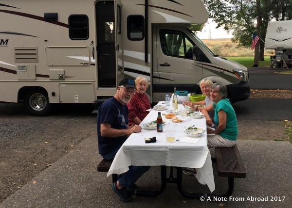 Well, of course every hotel room was already sold out along or near the path, but Tim was able to find us an Army Corps of Engineers campsite for Ellie Mae (our RV) just across the Columbia river from them near Kennewick, Washington.