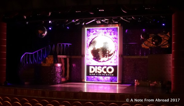 A production show, “Blame it on the Boogie” was presented in the Princess Theater. It was cheerful, the music familiar, but the dance quality was not quite as professional as some of the other production pieces we have watched. Maybe I have been watching too much “So You Think You Can Dance”, and have become more of a dance critic 🙂 But after saying that, I have to give them loads of credit that they are performing at sea, on a moving ship, and sometimes with stormy seas!