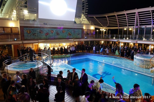 Out on the main deck, the place was starting to hop. In fact, we were surprised to find so many still up, as normally, on other nights, by 10:00 or 11:00 p.m. the ship had started to wind down. The DJ was pumping out tunes and the crowd, young and old were dancing all around the pool.